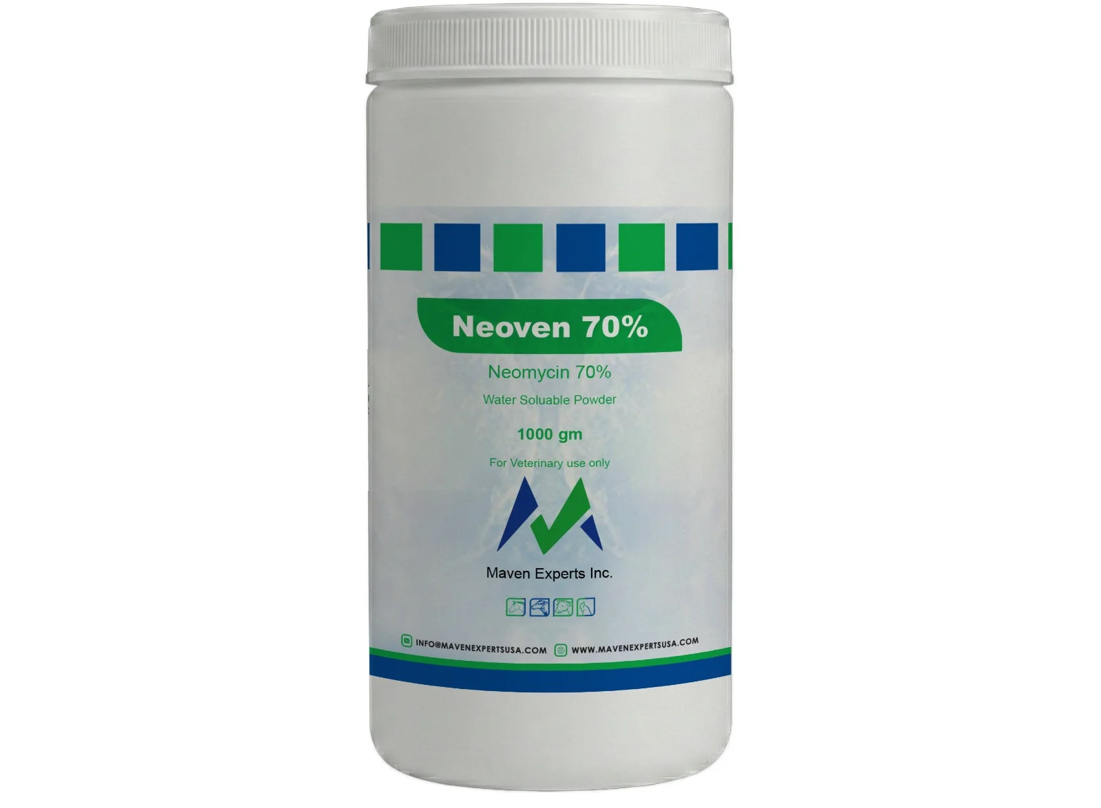Neoven 70% is recommended for the prevention and management of bacterial enteritis in calves, sheep, goats, swine, and poultry caused by bacteria sensitive to neomycin, such as *E. coli*, *Salmonella spp.*, and *Campylobacter spp.*